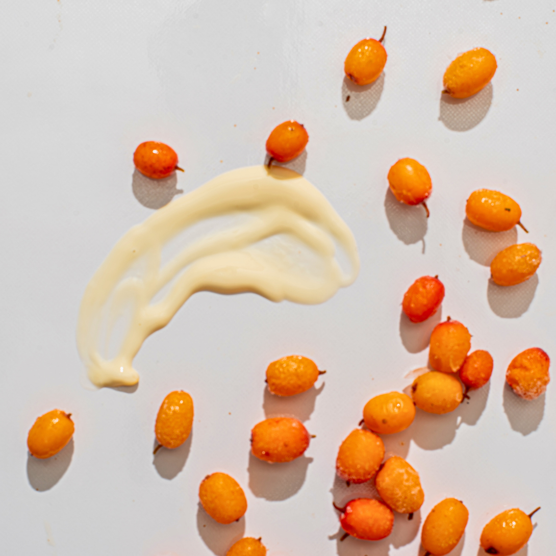 Aqua, Helianthus Annuus (Sunflower) Seed Oil, Cetearyl Olivate (and) Sorbitan Olivate, Vitis Vinifera Seed Oil, Leuconostoc/Radish Root Ferment Filtrate, Hippophae Rhamnoides Seed Oil, Hippophae Rhamnoides Fruit Oil, Maris Sal, Gluconolactone, Arctium Lappa Root Extract, Rosmarinus Officinalis Leaf Oil, Cymbopogon Martini Oil, Citrus Medica Limonum Peel Oil, Sodium Benzoate.